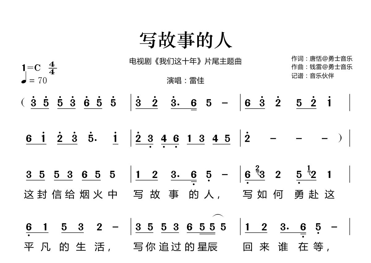 《写故事的人》是雷佳演唱的一首歌曲,这份简谱共有两张高清图谱,图谱由 @音乐伙伴 编配上传《我们这十年》电视剧片尾主题曲。