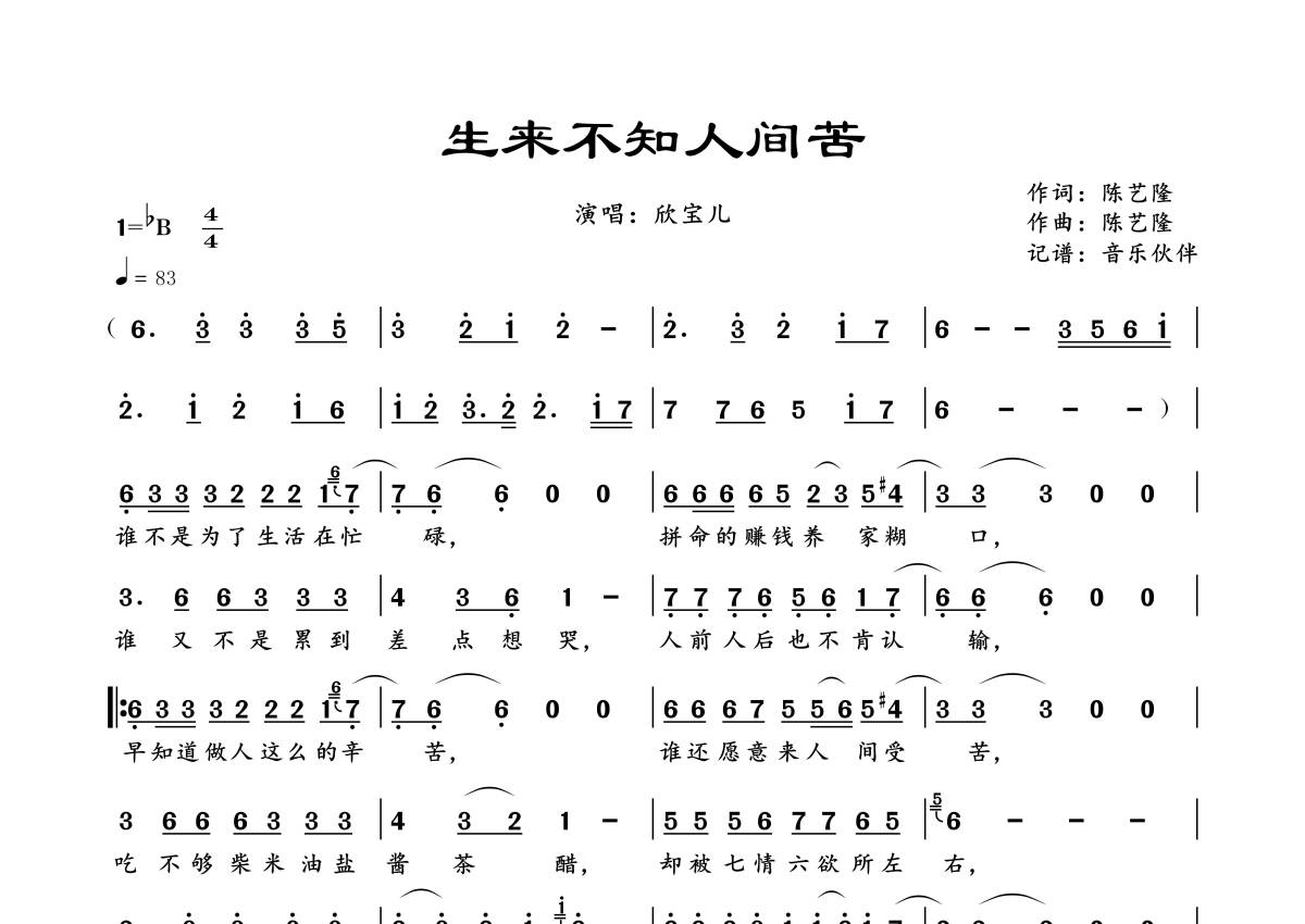 《生来不知人间苦》是欣宝儿演唱的一首歌曲,拍号为4/4拍,歌曲速度为每分钟83拍,这份简谱共有一张高清图谱,图谱由 @音乐伙伴 编配上传。