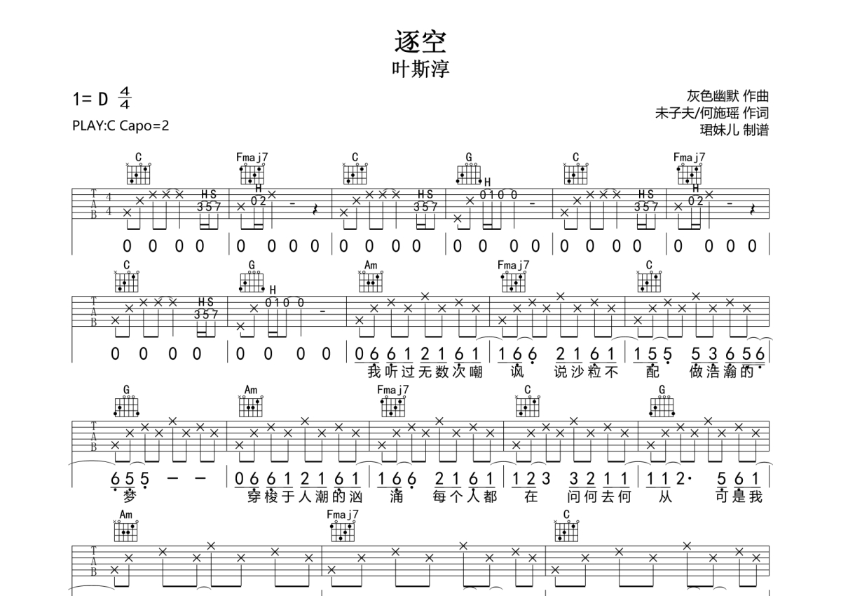 《逐空》是叶斯淳演唱的一首歌曲,拍号为4/4拍,歌曲速度为每分钟85拍,歌曲原调为D调,但由于原调指法比较难,为了方便弹奏,本吉他谱采用的是C调指法编配,变调夹2品弹奏即为原调,当然也可以根据自己的音域改变变调夹位置,或者通过改变和弦调性,以方便自己弹奏,这份吉他谱共有两张高清图谱,图谱由 @珺妹儿 编配上传,图谱使用六线谱编配,包含吉他和弦指法、简谱以及歌词部分,使用这份逐空吉他谱,可以让你更加方便地掌握这首歌曲的弹唱技巧,快来尝试吧。