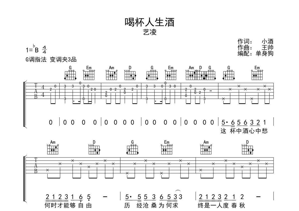 《喝杯人生酒》是艺凌演唱的一首歌曲,拍号为4/4拍,歌曲原调为Bb调,但由于原调指法比较难,为了方便弹奏,本吉他谱采用的是G调指法编配,变调夹3品弹奏即为原调,当然也可以根据自己的音域改变变调夹位置,或者通过改变和弦调性,以方便自己弹奏,这份吉他谱共有两张高清图谱,图谱由 @单身狗 编配上传,图谱使用六线谱编配,包含吉他和弦指法、简谱以及歌词部分,使用这份喝杯人生酒吉他谱,可以让你更加方便地掌握这首歌曲的弹唱技巧,快来尝试吧。