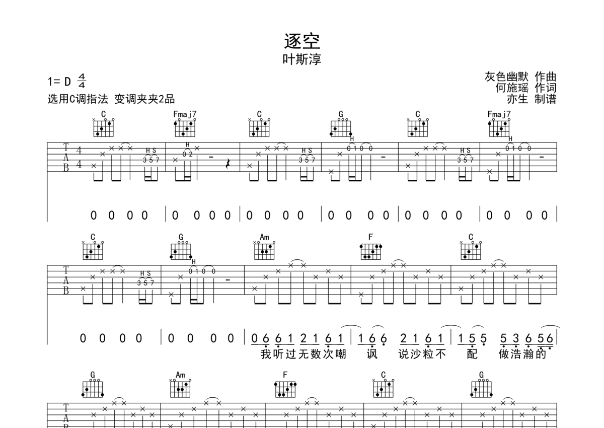 叶斯淳《逐空》吉他谱 - C调弹唱六线谱