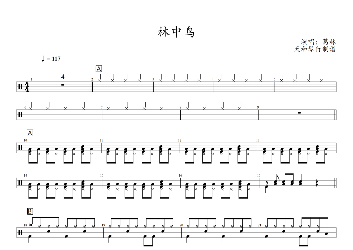 《林中鸟》是Beyond演唱的一首歌曲,拍号为4/4拍,歌曲速度为每分钟117拍,这份架子鼓谱共有三张高清图谱,图谱由 @音符喷血者 编配上传,图谱使用五线谱编配,使用这份林中鸟架子鼓谱,你将能够轻松地敲打出这首Beyond的林中鸟,快来尝试吧。