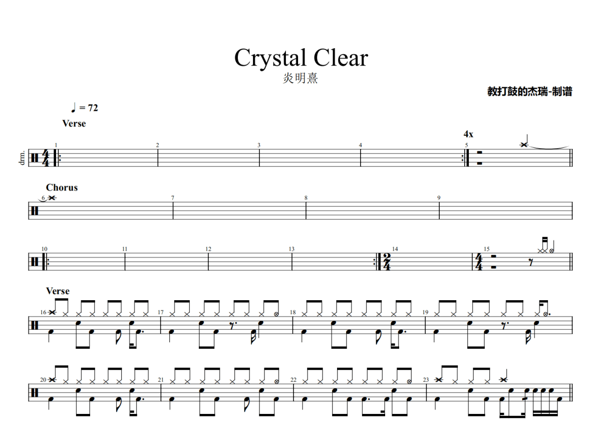 《Crystal Clear》是炎明熹演唱的一首歌曲,拍号为4/4拍,歌曲速度为每分钟72拍,这份架子鼓谱共有一张高清图谱,图谱由 @Jerry 编配上传,图谱使用五线谱编配,使用这份Crystal Clear架子鼓谱,你将能够轻松地敲打出这首炎明熹的Crystal Clear,快来尝试吧。