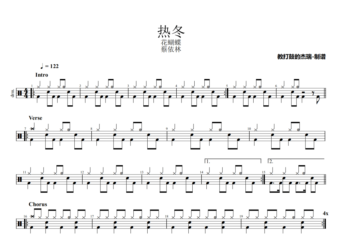 《热冬》是蔡依林演唱的一首歌曲,拍号为4/4拍,歌曲速度为每分钟122拍,这份架子鼓谱共有两张高清图谱,图谱由 @Jerry 编配上传,图谱使用五线谱编配,使用这份热冬架子鼓谱,你将能够轻松地敲打出这首蔡依林的热冬,快来尝试吧。