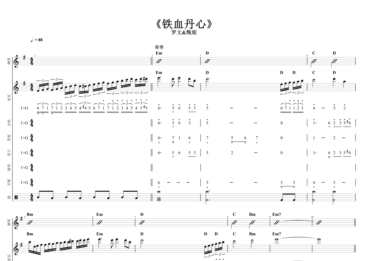 《铁血丹心》是罗文甄妮演唱的一首歌曲,石头音乐原版记谱,拍号为4/4拍,歌曲速度为每分钟88拍,这份乐队总谱共有四张高清图谱,图谱由 @石头音乐 编配上传。