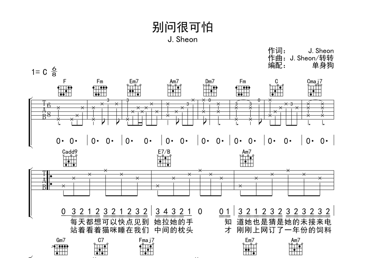《别问很可怕》是J.Sheon演唱的一首歌曲,拍号为6/8拍,歌曲原调为C调,本吉他谱采用的是C调指法编配,演奏时不需要使用变调夹即为原调,这份吉他谱共有三张高清图谱,图谱由 @单身狗 编配上传,图谱使用六线谱编配,包含吉他和弦指法、简谱以及歌词部分,使用这份别问很可怕吉他谱,可以让你更加方便地掌握这首歌曲的弹唱技巧,快来尝试吧。
