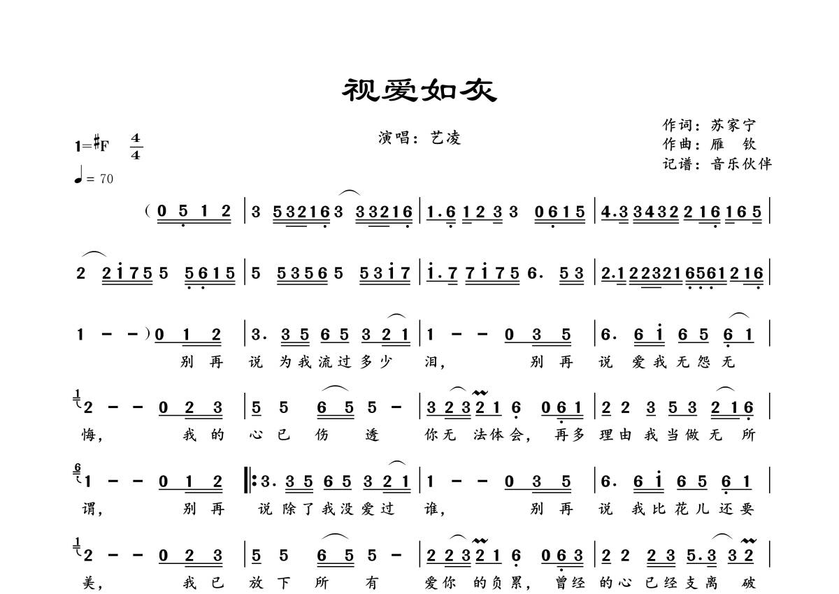 《视爱如灰》是艺凌演唱的一首歌曲,拍号为4/4拍,歌曲速度为每分钟70拍,这份简谱共有一张高清图谱,图谱由 @音乐伙伴 编配上传。