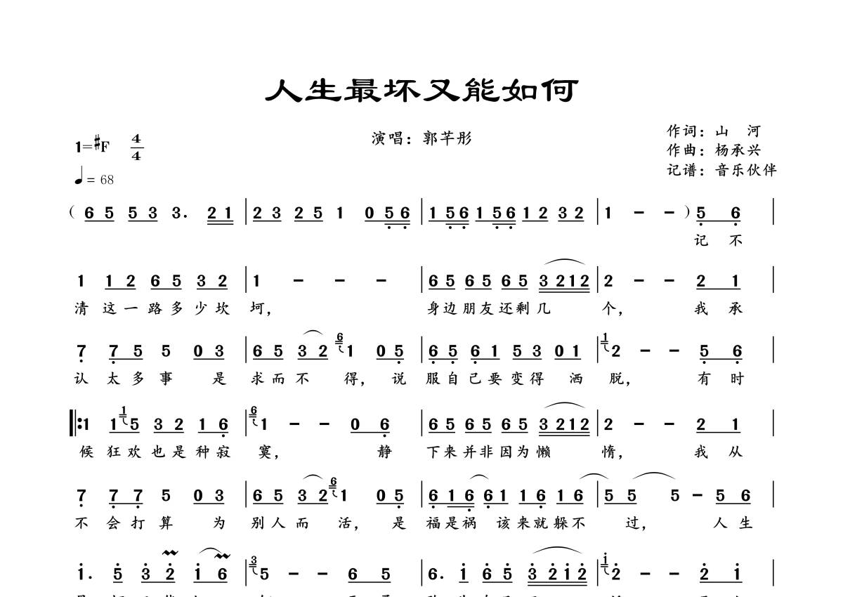 《人生最坏又能如何》是郭芊彤演唱的一首歌曲,拍号为4/4拍,歌曲速度为每分钟68拍,这份简谱共有一张高清图谱,图谱由 @音乐伙伴 编配上传。