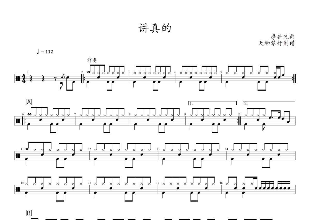 《讲真的》是摩登兄弟演唱的一首歌曲,拍号为4/4拍,歌曲速度为每分钟112拍,这份架子鼓谱共有两张高清图谱,图谱由 @音符喷血者 编配上传,图谱使用五线谱编配,使用这份讲真的架子鼓谱,你将能够轻松地敲打出这首摩登兄弟的讲真的,快来尝试吧。