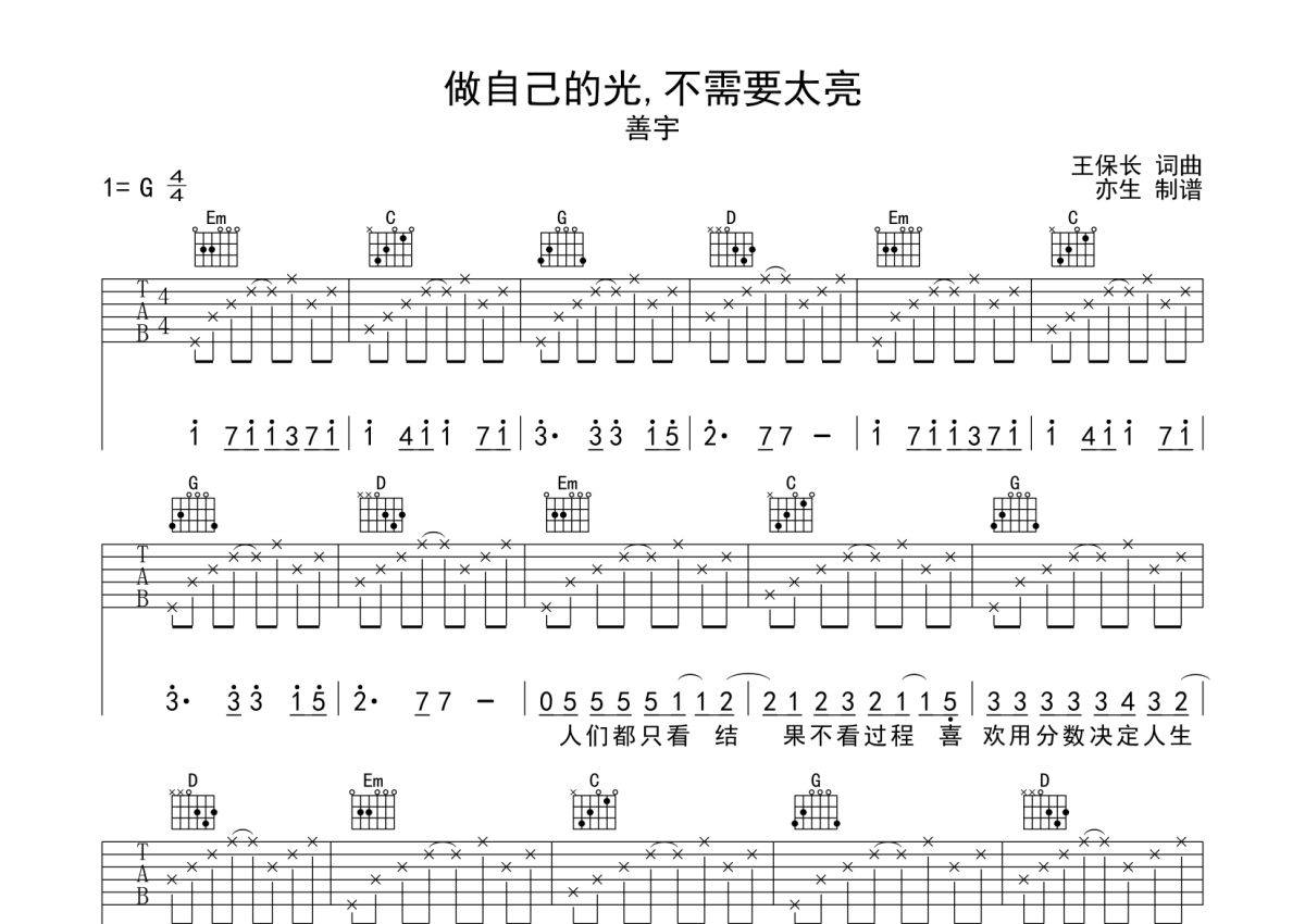 善宇《做自己的光,不需要太亮》吉他谱 - G调弹唱六线谱