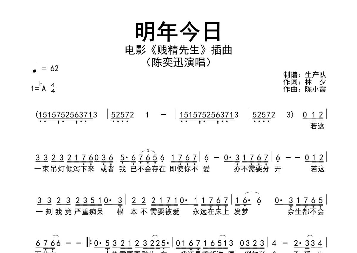 《明年今日》是陈奕迅演唱的一首歌曲,简谱,拍号为4/4拍,歌曲速度为每分钟62拍,这份简谱共有一张高清图谱,图谱由 @生产队 编配上传陈奕迅演唱的歌曲《明年今日》简谱。
