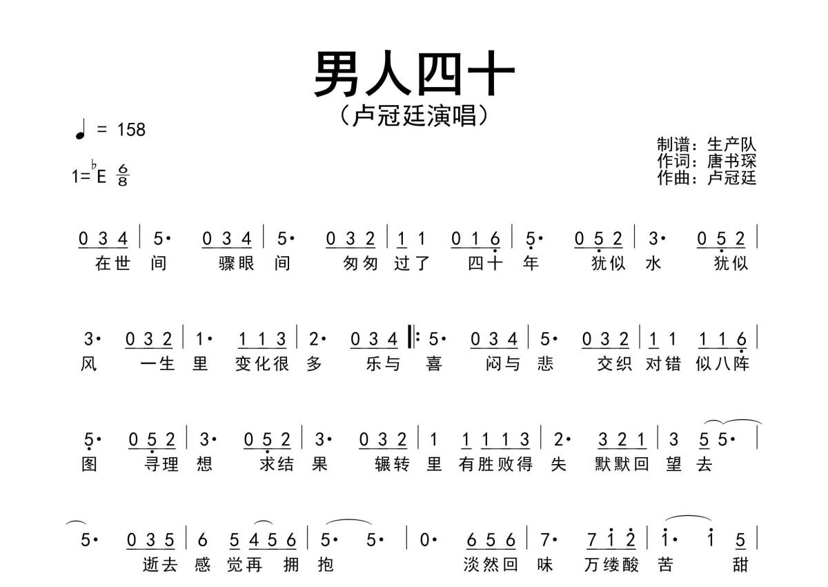 《男人四十》是卢冠廷演唱的一首歌曲,简谱,拍号为6/8拍,歌曲速度为每分钟158拍,这份简谱共有一张高清图谱,图谱由 @生产队 编配上传卢冠廷演唱的歌曲《男人四十》简谱。