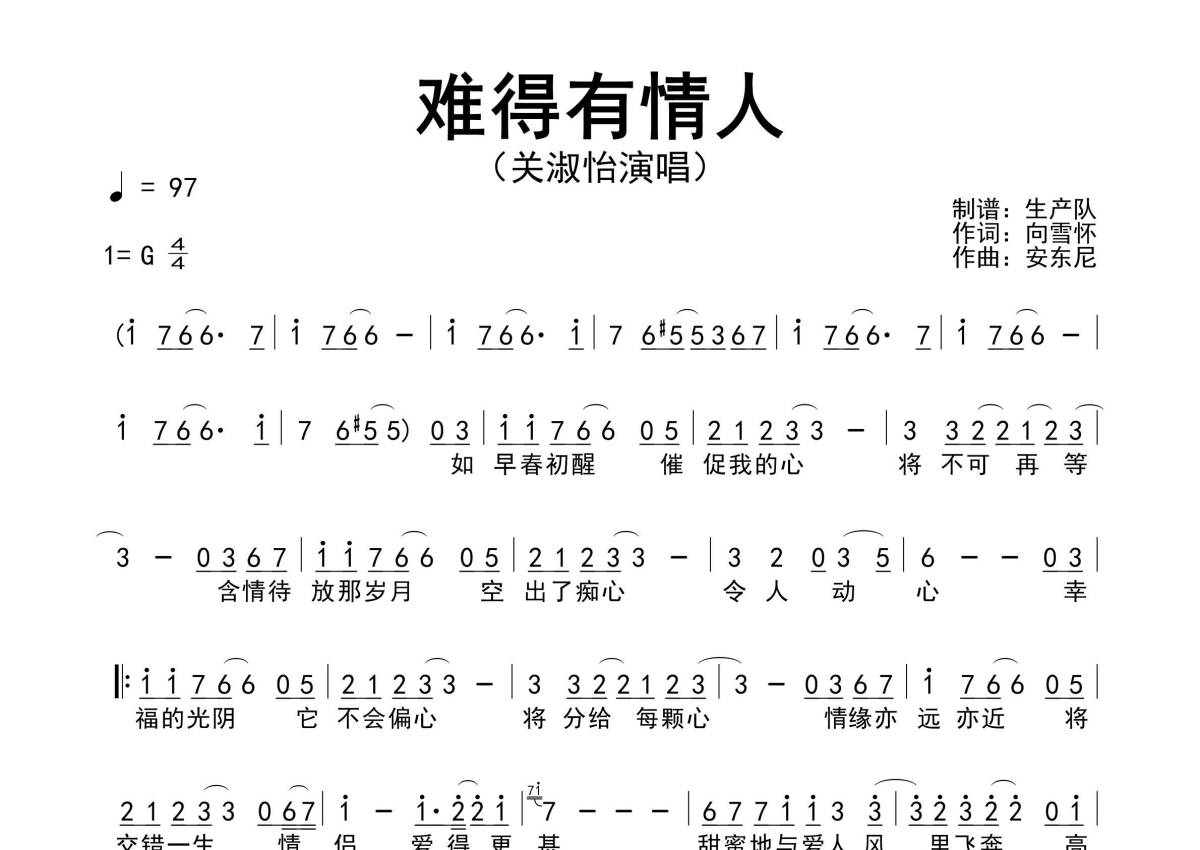 《难得有情人》是关淑怡演唱的一首歌曲,粤语版,拍号为4/4拍,歌曲速度为每分钟97拍,这份简谱共有一张高清图谱,图谱由 @生产队 编配上传关淑怡演唱的歌曲《难得有情人》(粤语版)简谱。