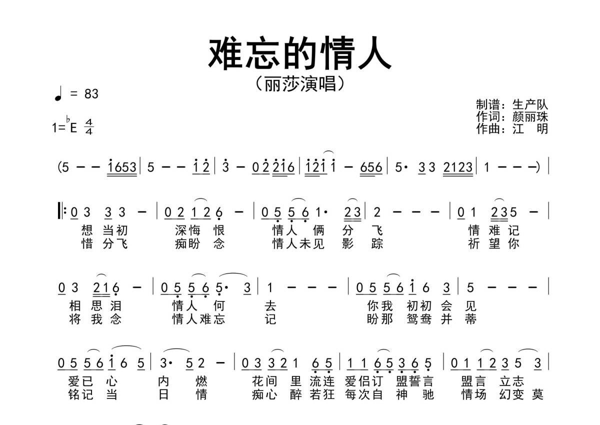 《难忘的情人》是丽莎演唱的一首歌曲,简谱,拍号为4/4拍,歌曲速度为每分钟83拍,这份简谱共有一张高清图谱,图谱由 @生产队 编配上传丽莎演唱的歌曲《难忘的情人》简谱。