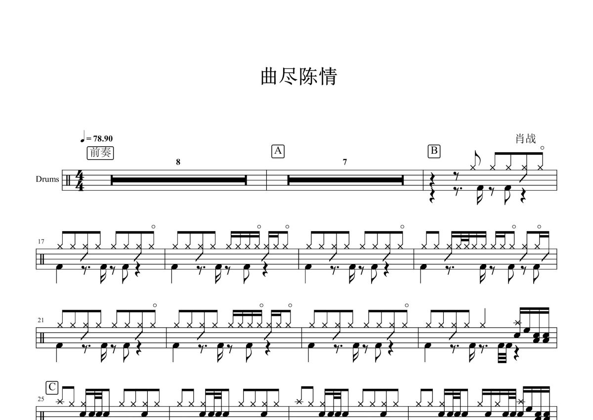 《曲尽陈情》是肖战演唱的一首歌曲,这份鼓谱共有两张高清图谱,图谱由 @打鼓谱 编配上传,图谱使用五线谱编配,使用这份曲尽陈情架子鼓谱,你将能够轻松地敲打出这首肖战的曲尽陈情,快来尝试吧。《曲尽陈情》是电视剧《陈情令》魏无羡人物曲,由Within_轶名谱曲,易者连消醉清酒填词,肖战演唱。肖战,1991年10月5日出生于重庆市,中国内地男演员、歌手。