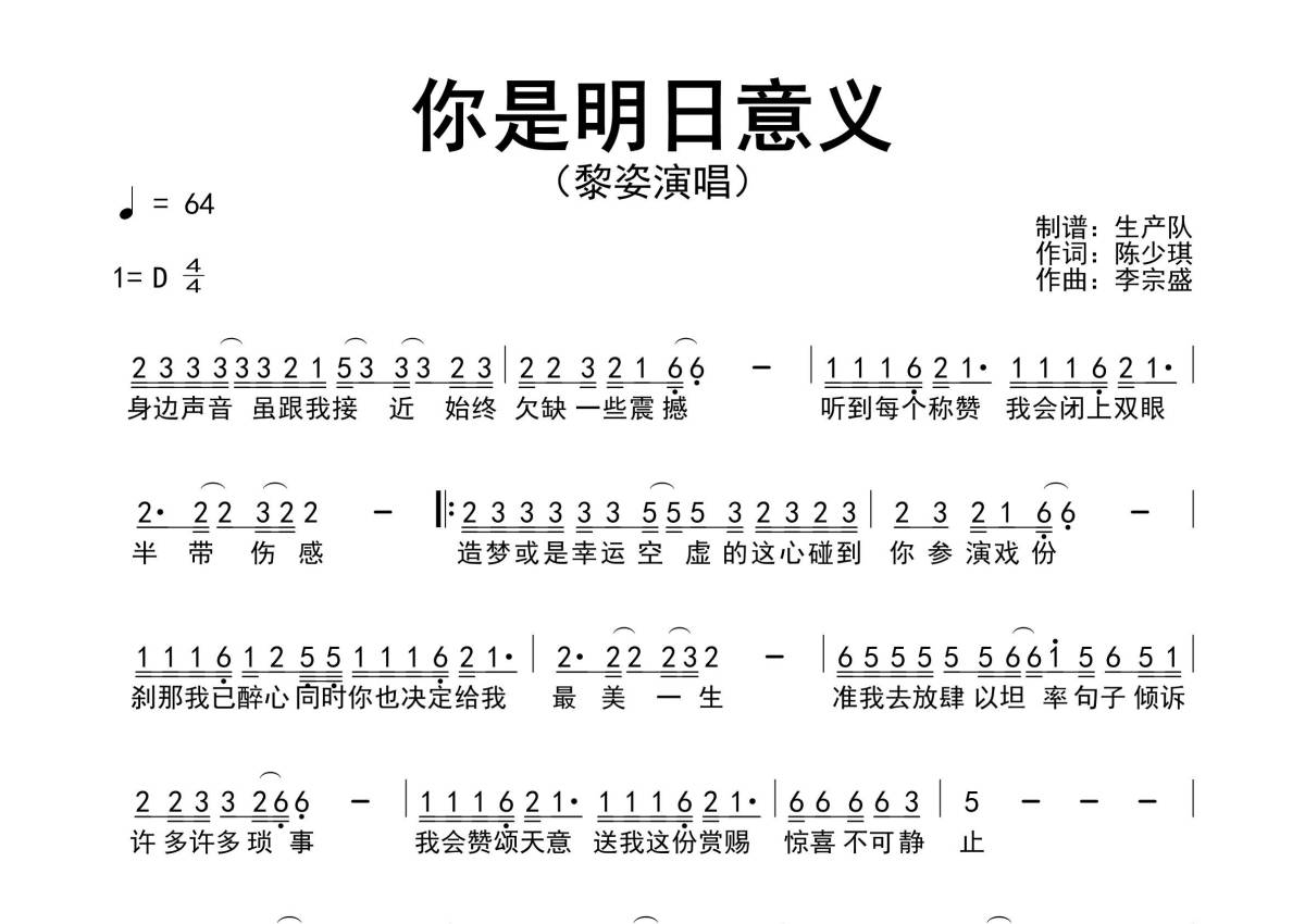 《你是明日意义》是黎姿演唱的一首歌曲,简谱,拍号为4/4拍,歌曲速度为每分钟64拍,这份简谱共有一张高清图谱,图谱由 @生产队 编配上传黎姿演唱的歌曲《你是明日意义》简谱。