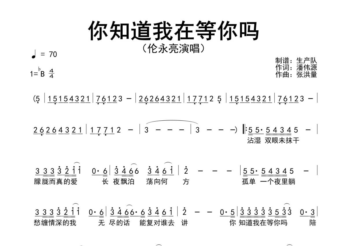《你知道我在等你吗》是伦永亮演唱的一首歌曲,粤语版,拍号为4/4拍,歌曲速度为每分钟70拍,这份简谱共有一张高清图谱,图谱由 @生产队 编配上传伦永亮演唱的歌曲《你知道我在等你吗》(粤语版)简谱。
