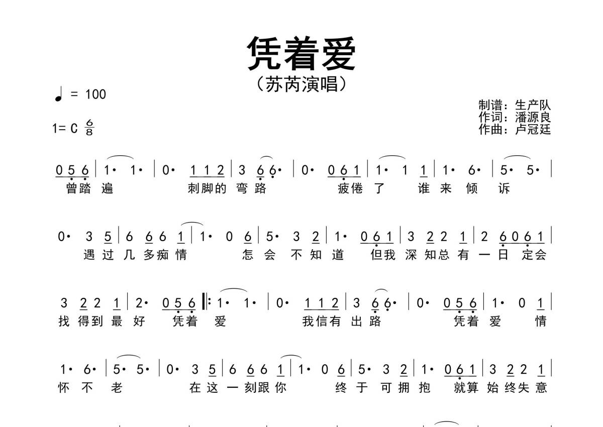 《凭着爱》是苏芮演唱的一首歌曲,简谱,拍号为6/8拍,歌曲速度为每分钟100拍,这份简谱共有一张高清图谱,图谱由 @生产队 编配上传苏芮演唱的歌曲《凭着爱》简谱。
