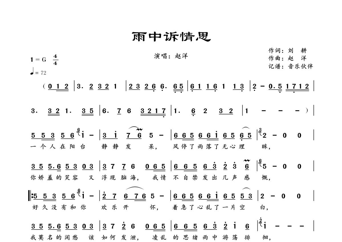 《雨中诉情思》是赵洋演唱的一首歌曲,拍号为4/4拍,歌曲速度为每分钟72拍,这份简谱共有一张高清图谱,图谱由 @音乐伙伴 编配上传。