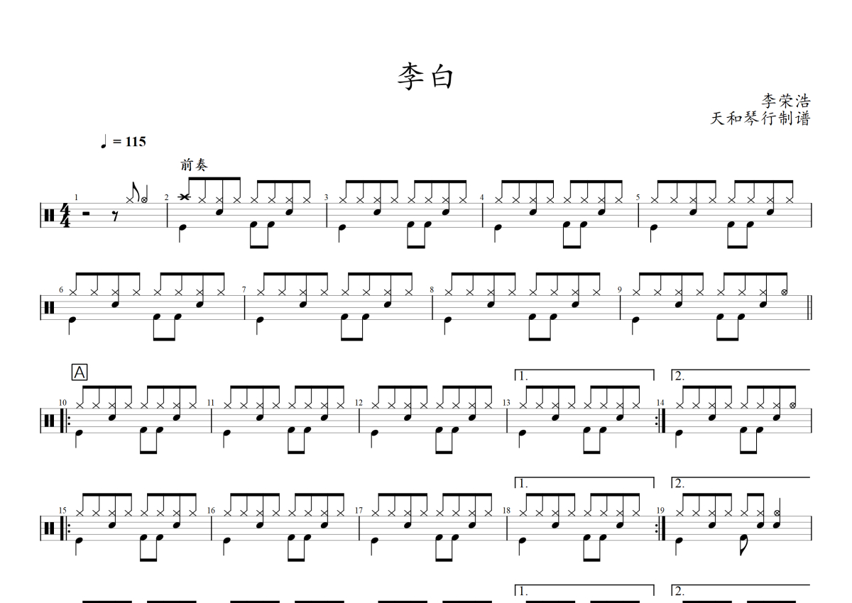 《李白》是李荣浩演唱的一首歌曲,拍号为4/4拍,歌曲速度为每分钟115拍,这份架子鼓谱共有三张高清图谱,图谱由 @音符喷血者 编配上传,图谱使用五线谱编配,使用这份李白架子鼓谱,你将能够轻松地敲打出这首李荣浩的李白,快来尝试吧。