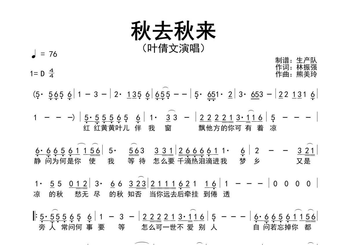 《秋去秋来》是叶倩文演唱的一首歌曲,简谱,拍号为4/4拍,歌曲速度为每分钟76拍,这份简谱共有一张高清图谱,图谱由 @生产队 编配上传叶倩文演唱的歌曲《秋去秋来》简谱。