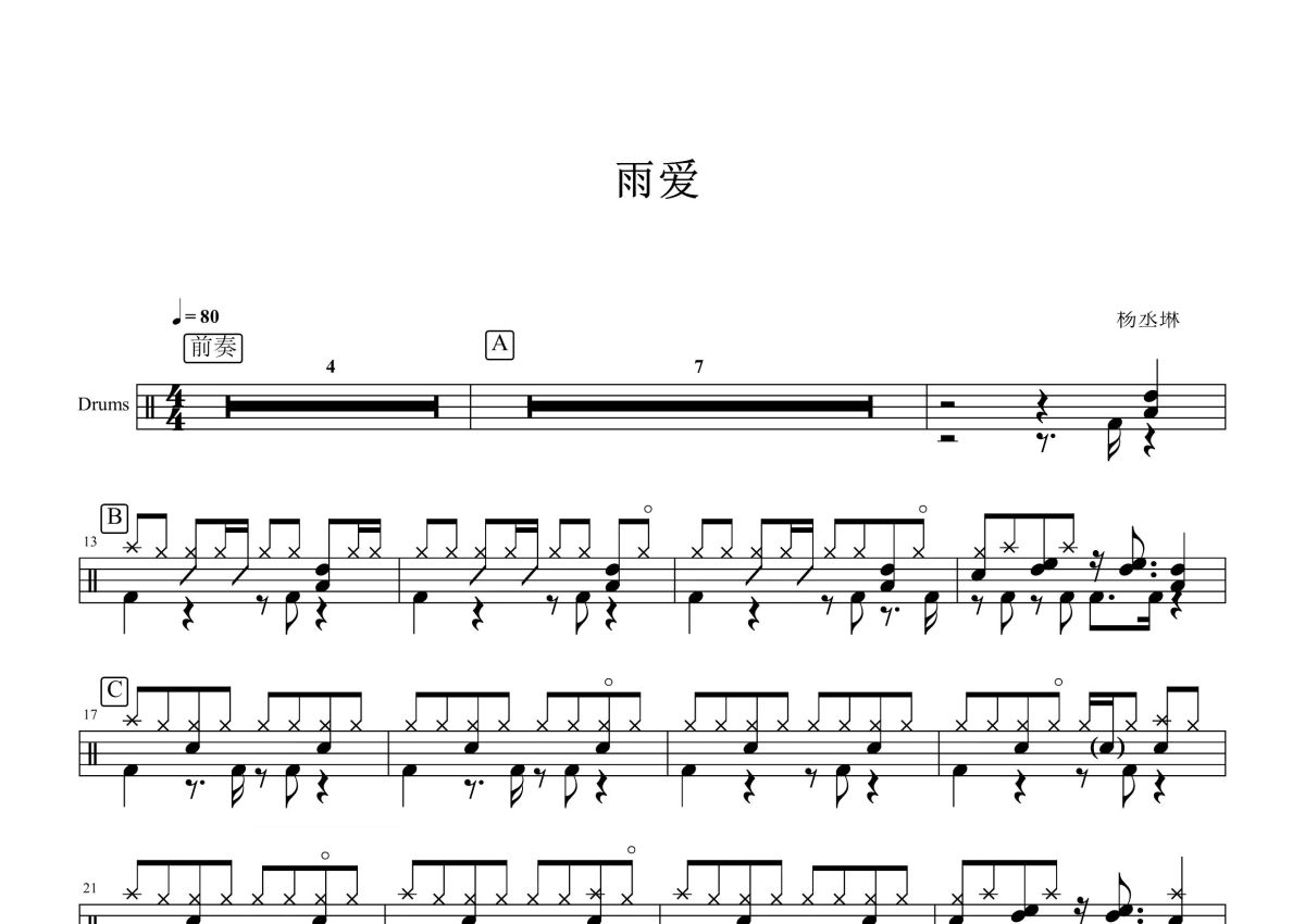 《雨爱》是杨丞琳演唱的一首歌曲,这份鼓谱共有三张高清图谱,图谱由 @打鼓谱 编配上传,图谱使用五线谱编配,使用这份雨爱架子鼓谱,你将能够轻松地敲打出这首杨丞琳的雨爱,快来尝试吧。《雨爱》是由Wonderful作词,金大洲作曲,杨丞琳演唱的一首歌曲,收录于杨丞琳2010年发行的专辑《Rainie & Love....? 雨爱》中,同时这首歌也是杨丞琳主演偶像剧《海派甜心》的片尾曲。杨丞琳(Rainie Yang),1984年6月4日出生于台湾省台北市,中国台湾女歌手、演员、导演、主持人,是一位多栖发展的艺人。