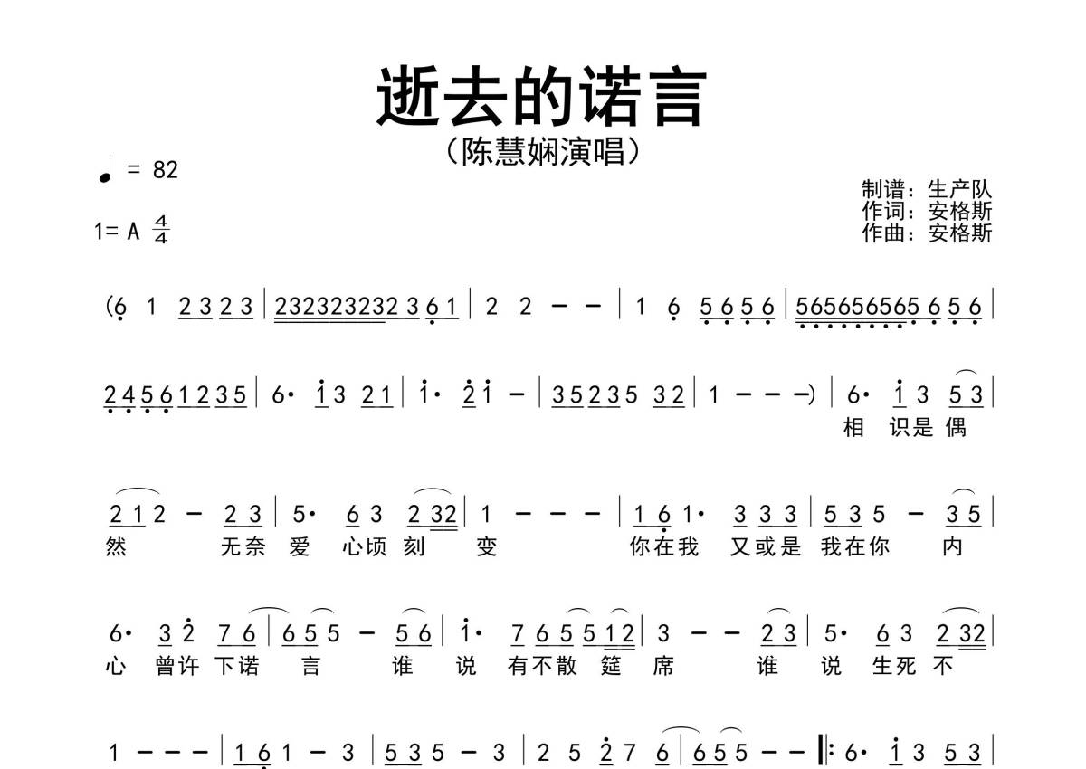《逝去的诺言》是陈慧娴演唱的一首歌曲,简谱,拍号为4/4拍,歌曲速度为每分钟82拍,这份简谱共有一张高清图谱,图谱由 @生产队 编配上传陈慧娴演唱的歌曲《逝去的诺言》简谱。
