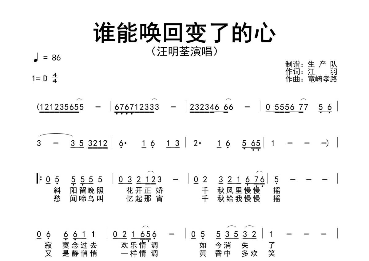 《谁能唤回变了的心》是汪明荃演唱的一首歌曲,简谱,拍号为4/4拍,歌曲速度为每分钟86拍,这份简谱共有一张高清图谱,图谱由 @生产队 编配上传汪明荃演唱的歌曲《谁能唤回变了的心》简谱。