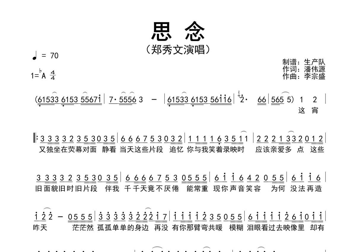 《思念》是郑秀文演唱的一首歌曲,简谱,拍号为4/4拍,歌曲速度为每分钟70拍,这份简谱共有一张高清图谱,图谱由 @生产队 编配上传郑秀文演唱的歌曲《思念》简谱。