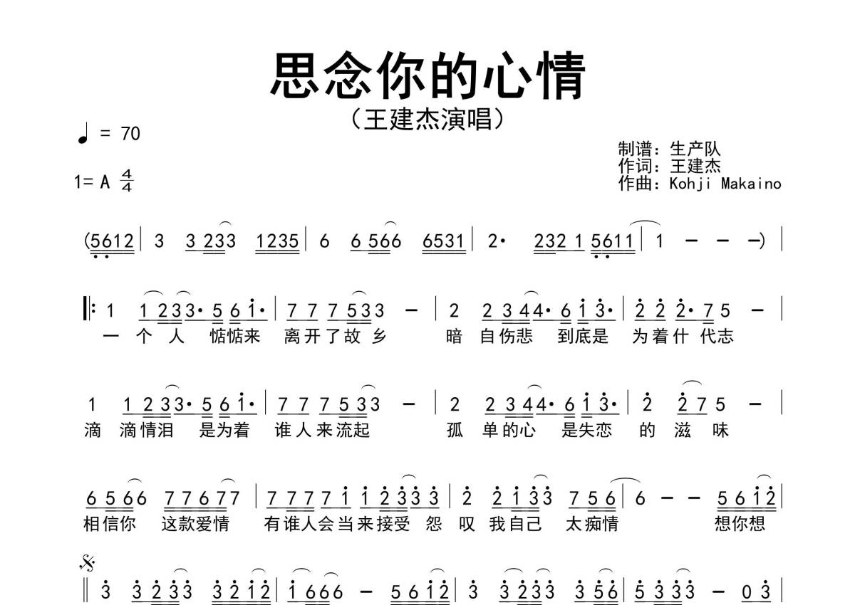 《思念你的心情》是王建杰演唱的一首歌曲,简谱,拍号为4/4拍,歌曲速度为每分钟70拍,这份简谱共有一张高清图谱,图谱由 @生产队 编配上传王建杰演唱的歌曲《思念你的心情》简谱。
