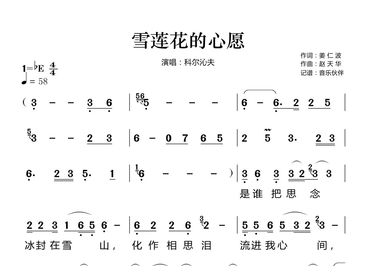 雪莲花的心愿简谱 - 科尔沁夫演唱
