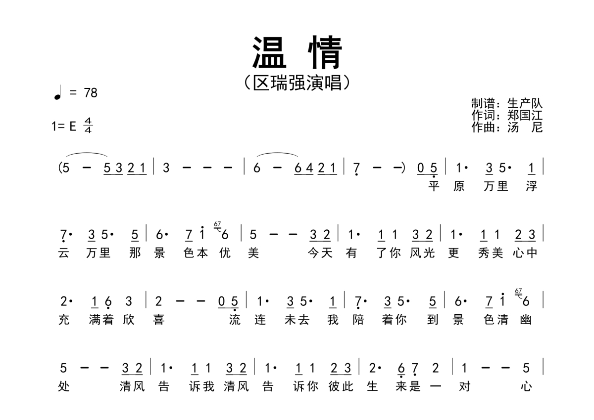 《温情》是区瑞强演唱的一首歌曲,简谱,拍号为4/4拍,歌曲速度为每分钟78拍,这份简谱共有一张高清图谱,图谱由 @生产队 编配上传区瑞强演唱的歌曲《温情》简谱。