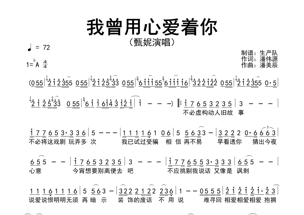《我曾用心爱着你》是甄妮演唱的一首歌曲,粤语版,拍号为4/4拍,歌曲速度为每分钟72拍,这份简谱共有一张高清图谱,图谱由 @生产队 编配上传甄妮演唱的歌曲《我曾用心爱着你》(粤语版)简谱。