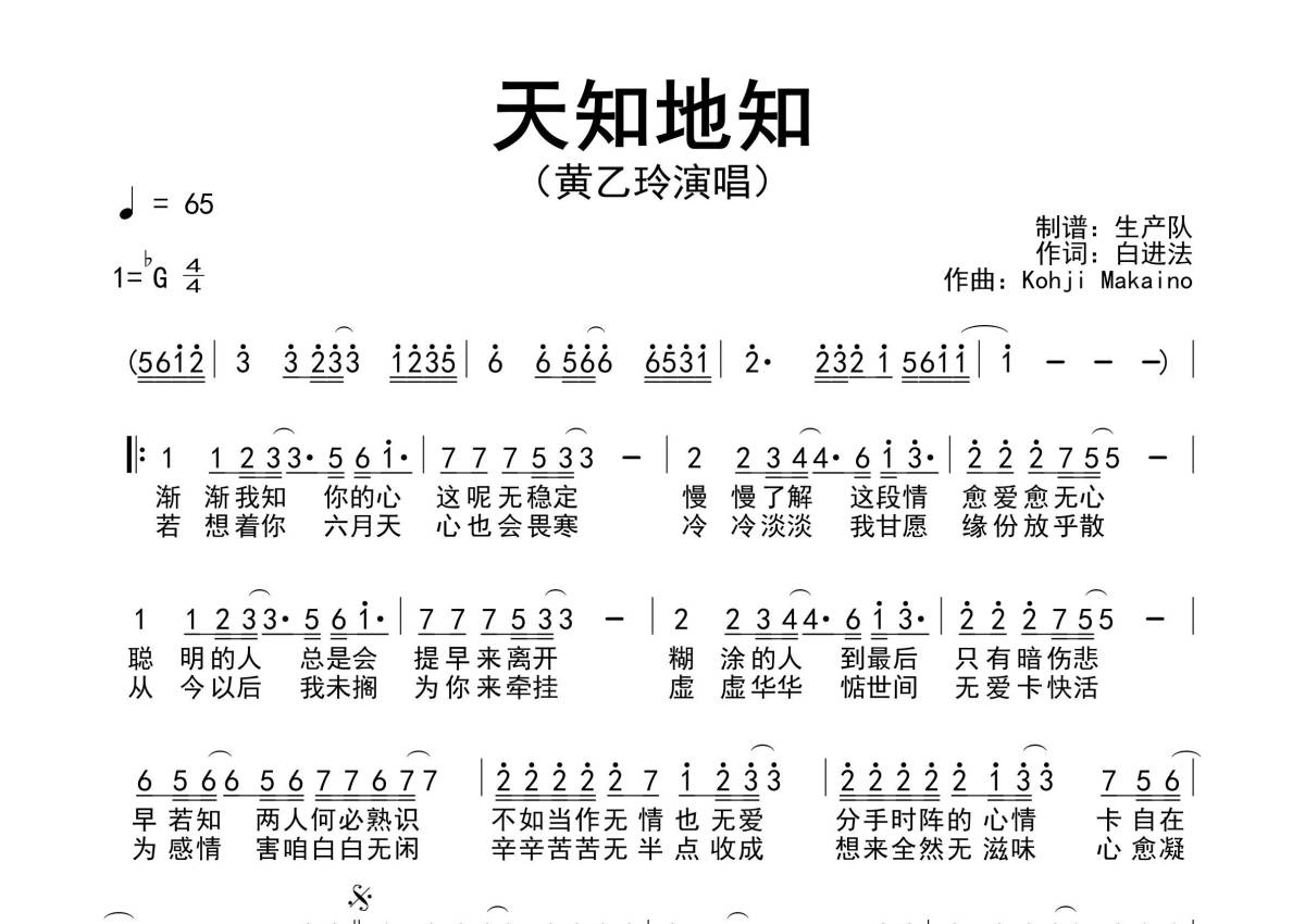 《天知地知》是黄乙玲演唱的一首歌曲,简谱,拍号为4/4拍,歌曲速度为每分钟65拍,这份简谱共有一张高清图谱,图谱由 @生产队 编配上传黄乙玲演唱的歌曲《天知地知》简谱。