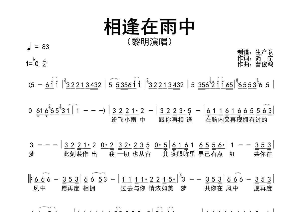 《相逢在雨中》是黎明演唱的一首歌曲,拍号为4/4拍,歌曲速度为每分钟83拍,这份简谱共有一张高清图谱,图谱由 @生产队 编配上传黎明演唱的歌曲《相逢在雨中》简谱。