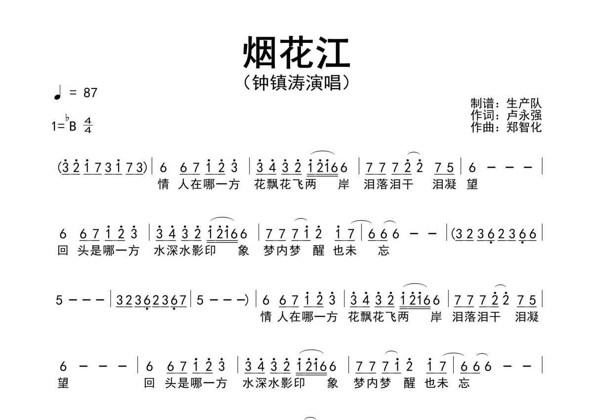 《烟花江》是钟镇涛演唱的一首歌曲,简谱,拍号为4/4拍,歌曲速度为每分钟86拍,这份简谱共有一张高清图谱,图谱由 @生产队 编配上传钟镇涛演唱的歌曲《烟花江》简谱。