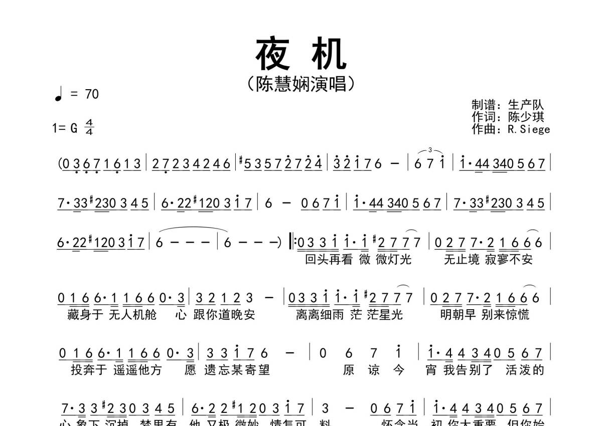 《夜机》是陈慧娴演唱的一首歌曲,简谱,拍号为4/4拍,歌曲速度为每分钟70拍,这份简谱共有一张高清图谱,图谱由 @生产队 编配上传陈慧娴演唱的歌曲《夜机》简谱。