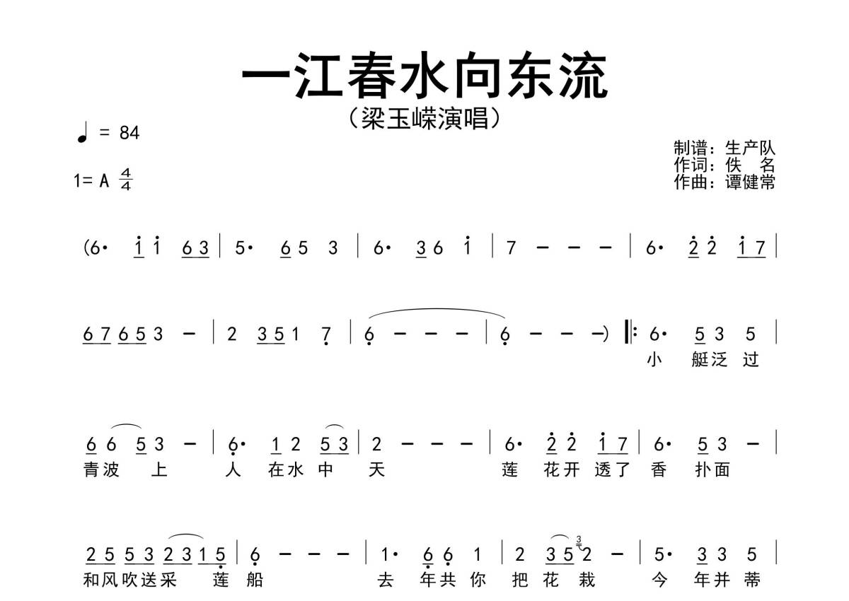 《一江春水向东流》是梁玉嵘演唱的一首歌曲,简谱,拍号为4/4拍,歌曲速度为每分钟84拍,这份简谱共有一张高清图谱,图谱由 @生产队 编配上传梁玉嵘演唱的歌曲《一江春水向东流》简谱。