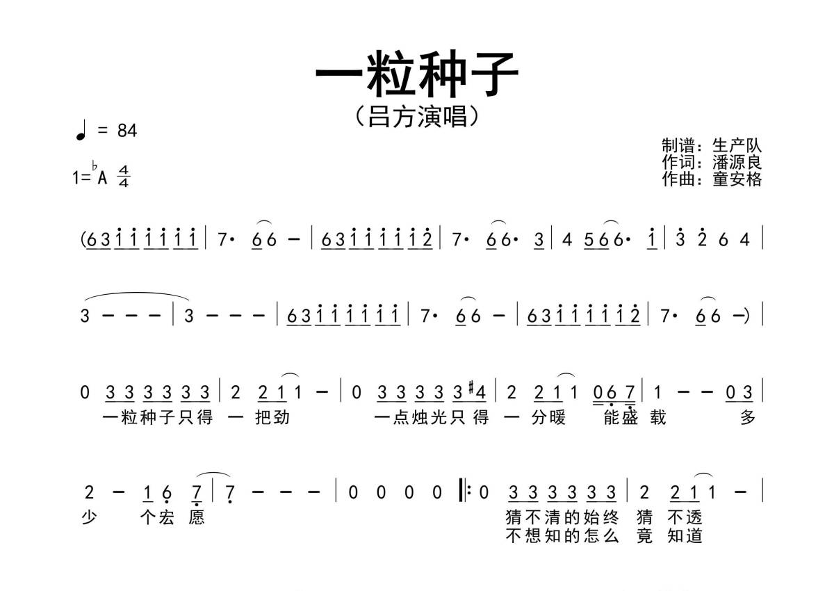 《一粒种子》是吕方演唱的一首歌曲,简谱,拍号为4/4拍,歌曲速度为每分钟84拍,这份简谱共有一张高清图谱,图谱由 @生产队 编配上传吕方演唱的歌曲《一粒种子》简谱。