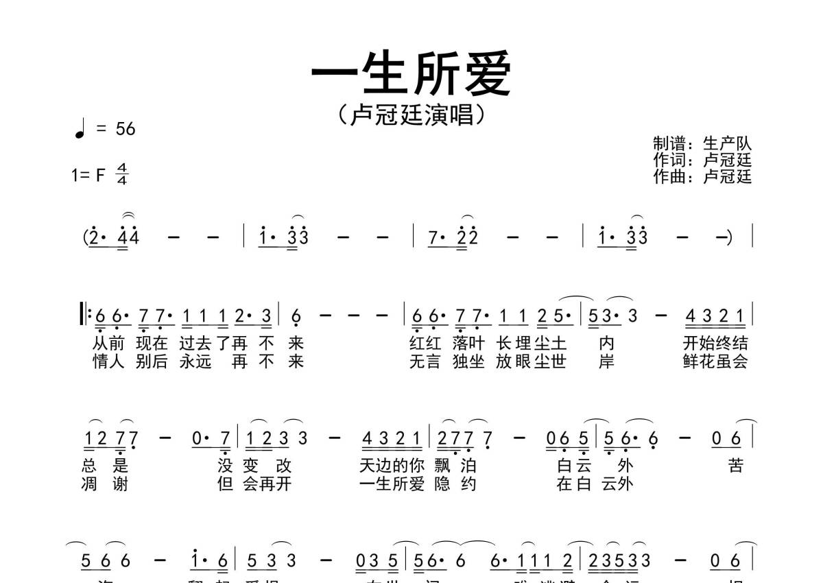 《一生所爱》是卢冠廷演唱的一首歌曲,简谱,拍号为4/4拍,歌曲速度为每分钟56拍,这份简谱共有一张高清图谱,图谱由 @生产队 编配上传卢冠廷演唱的歌曲《一生所爱》简谱。