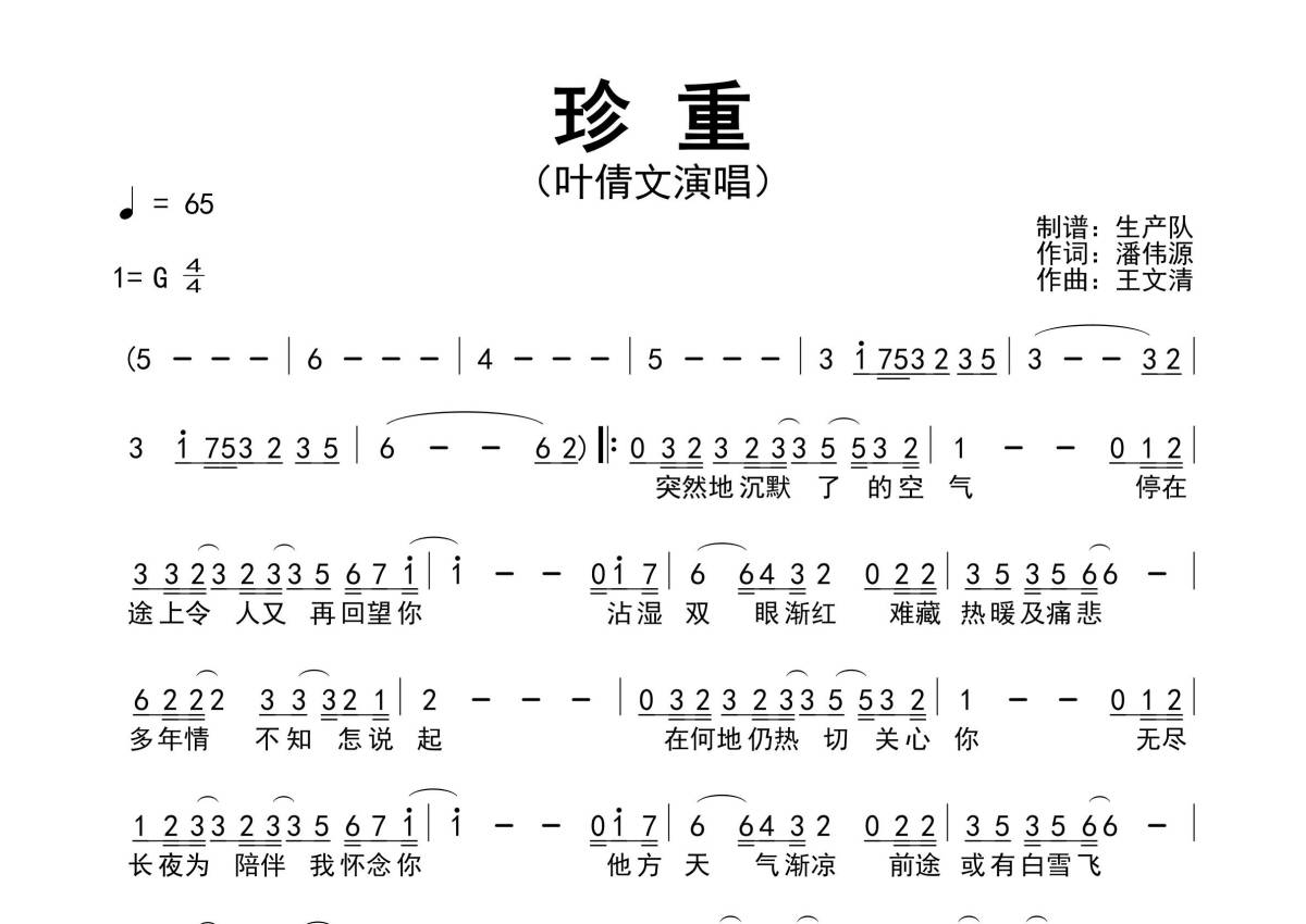 《珍重》是叶倩文演唱的一首歌曲,简谱,拍号为4/4拍,歌曲速度为每分钟65拍,这份简谱共有一张高清图谱,图谱由 @生产队 编配上传叶倩文演唱的歌曲《珍重》简谱。