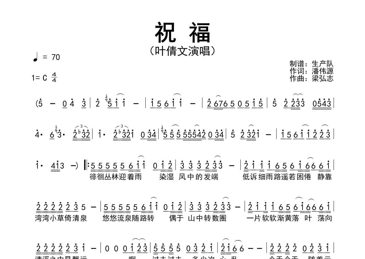 《祝福》是叶倩文演唱的一首歌曲,拍号为4/4拍,歌曲速度为每分钟70拍,这份简谱共有一张高清图谱,图谱由 @生产队 编配上传叶倩文演唱的歌曲《祝福》简谱。