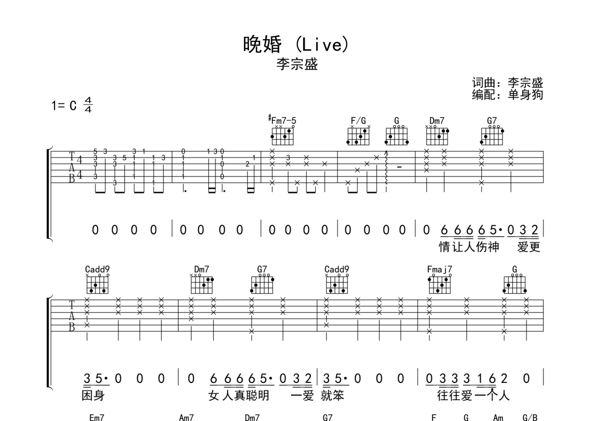 李宗盛《晚婚》吉他谱 - C调弹唱六线谱 - LIVE