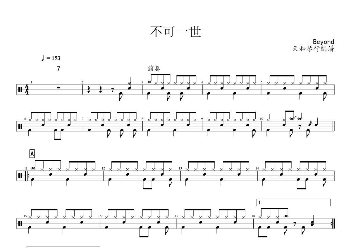 《不可一世》是Beyond演唱的一首歌曲,拍号为4/4拍,歌曲速度为每分钟153拍,这份架子鼓谱共有三张高清图谱,图谱由 @音符喷血者 编配上传,图谱使用五线谱编配,使用这份不可一世架子鼓谱,你将能够轻松地敲打出这首Beyond的不可一世,快来尝试吧。