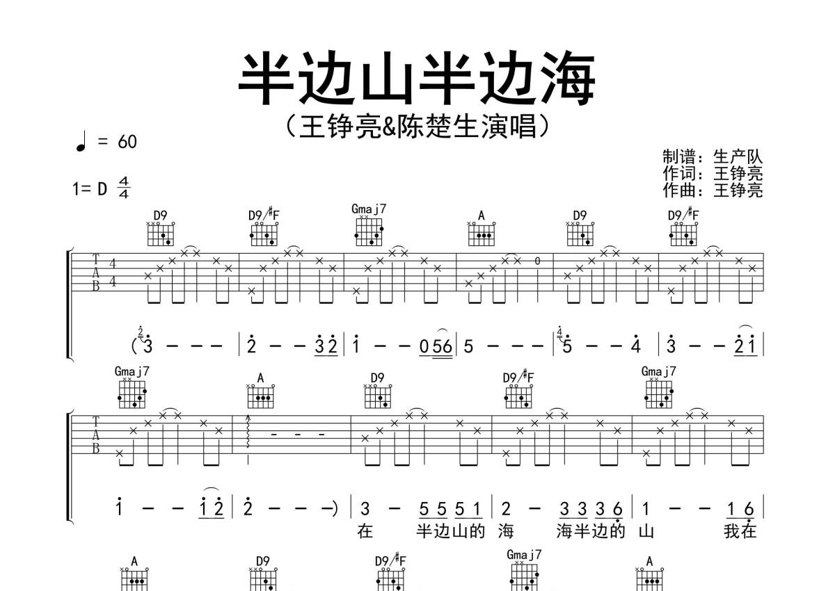 《半边山半边海》是王铮亮/陈楚生演唱的一首歌曲,精编完美版,拍号为4/4拍,歌曲速度为每分钟60拍,歌曲原调为D调,但由于原调指法比较难,为了方便弹奏,本吉他谱采用的是D调指法编配,演奏时不需要使用变调夹即为原调,这份吉他谱共有三张高清图谱,图谱由 @生产队 编配上传,图谱使用六线谱编配,包含吉他和弦指法、简谱以及歌词部分,使用这份半边山半边海吉他谱,可以让你更加方便地掌握这首歌曲的弹唱技巧,快来尝试吧。《半边山半边海》是由王铮亮&陈楚生演唱的歌曲,收录于2022年11月16日发行的专辑《还是爱着》中。本吉他谱根据原版D调指法编配,精编完美版,再现原版风采,值得推荐!。