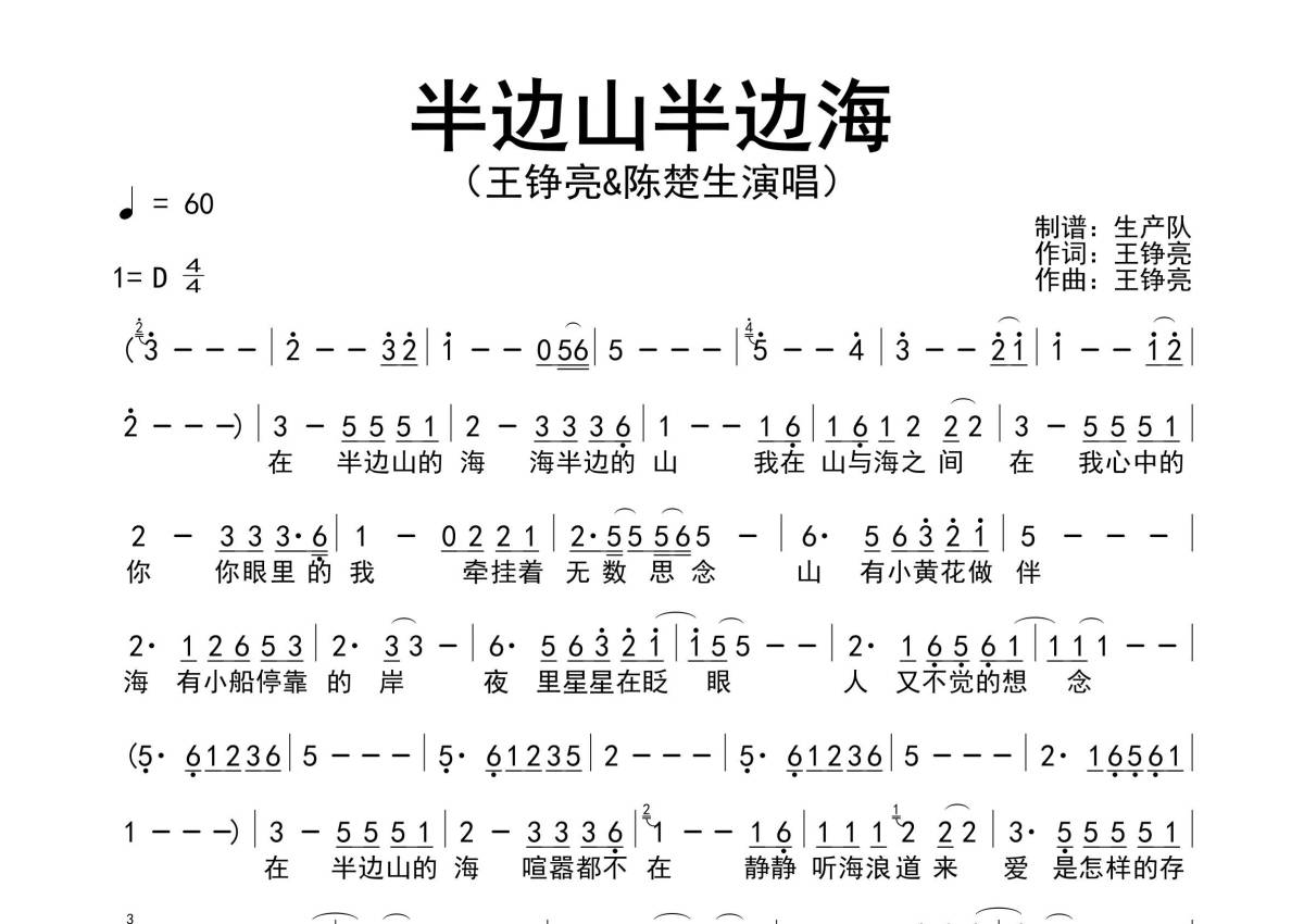 《半边山半边海》是王铮亮/陈楚生演唱的一首歌曲,原版简谱,拍号为4/4拍,歌曲速度为每分钟60拍,这份简谱共有一张高清图谱,图谱由 @生产队 编配上传王铮亮&陈楚生演唱的歌曲《半边山半边海》原版简谱。