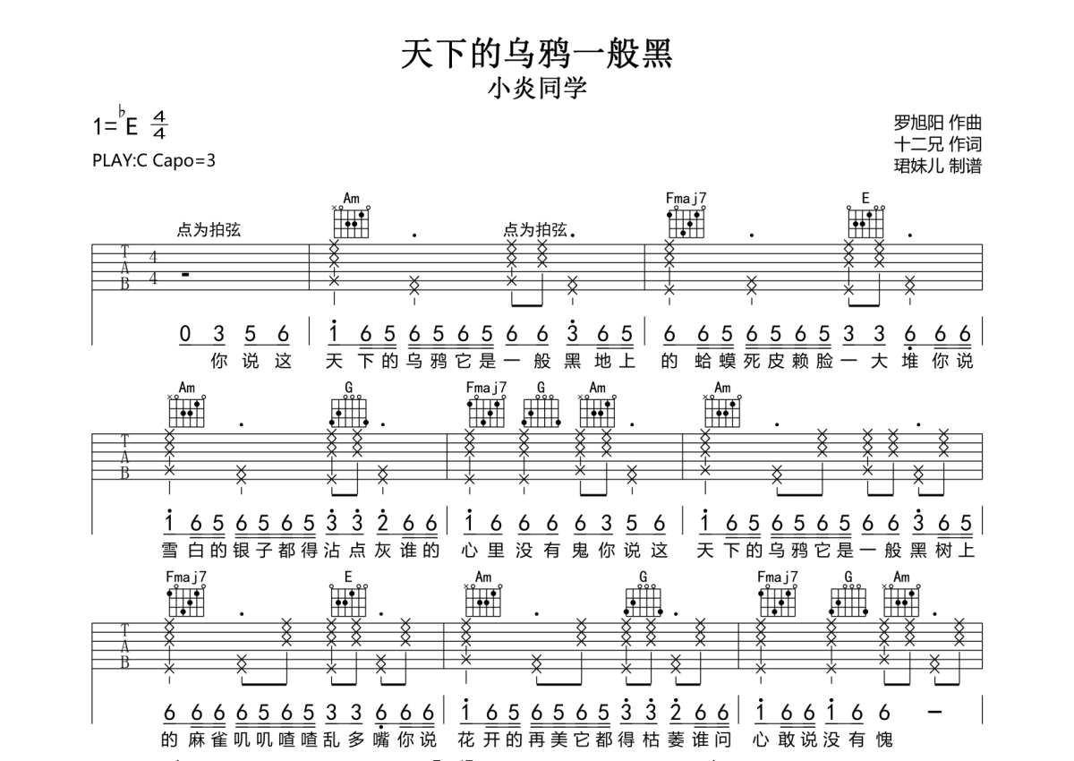 《天下的乌鸦一般黑》是小炎同学演唱的一首歌曲,拍号为4/4拍,歌曲速度为每分钟85拍,歌曲原调为C调,本吉他谱采用的是C调指法编配,变调夹3品弹奏即为原调,当然也可以根据自己的音域改变变调夹位置,或者通过改变和弦调性,以方便自己弹奏,这份吉他谱共有两张高清图谱,图谱由 @珺妹儿 编配上传,图谱使用六线谱编配,包含吉他和弦指法、简谱以及歌词部分,使用这份天下的乌鸦一般黑吉他谱,可以让你更加方便地掌握这首歌曲的弹唱技巧,快来尝试吧。