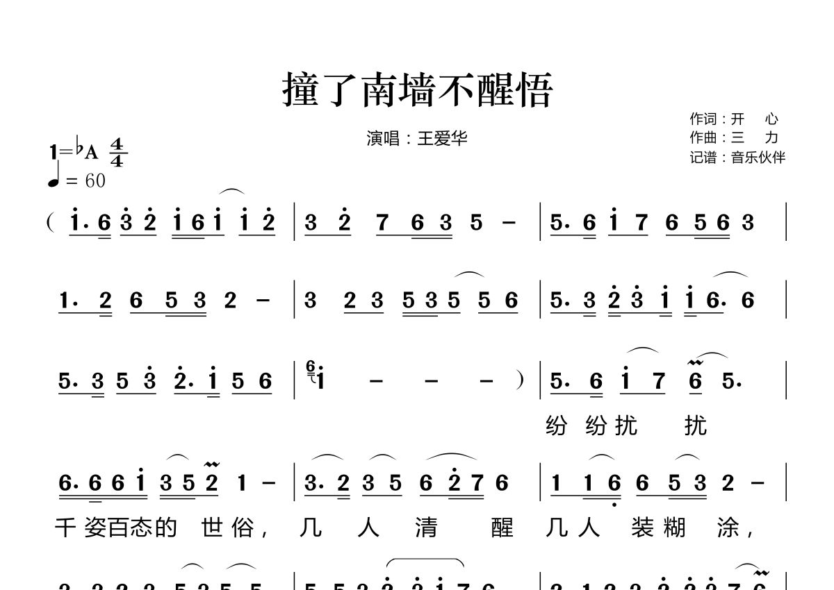 《撞了南墙不醒悟》是王爱华演唱的一首歌曲,这份简谱共有两张高清图谱,图谱由 @音乐伙伴 编配上传。