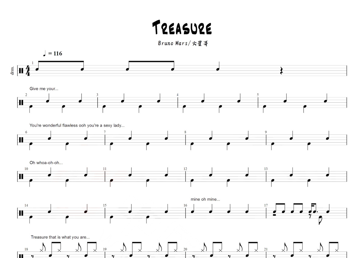 《Treasure》是火星哥Bruno mars (布鲁诺·马尔斯)演唱的一首歌曲,这份鼓谱共有两张高清图谱,图谱由 @打鼓谱 编配上传,图谱使用五线谱编配,使用这份Treasure架子鼓谱,你将能够轻松地敲打出这首火星哥Bruno mars (布鲁诺·马尔斯)的Treasure,快来尝试吧。《Treasure》是美国流行歌手布鲁诺·马尔斯演唱的一首流行歌曲,词曲由Phredley Brown、布鲁诺·马尔斯、菲利普·劳伦斯和阿里·莱文创作完成,收录在布鲁诺·马尔斯第二张录音室专辑《Unorthodox Jukebox》中,作为推广专辑的第三支歌曲 ,于2013年5月10日由大西洋唱片发行 [2] 。