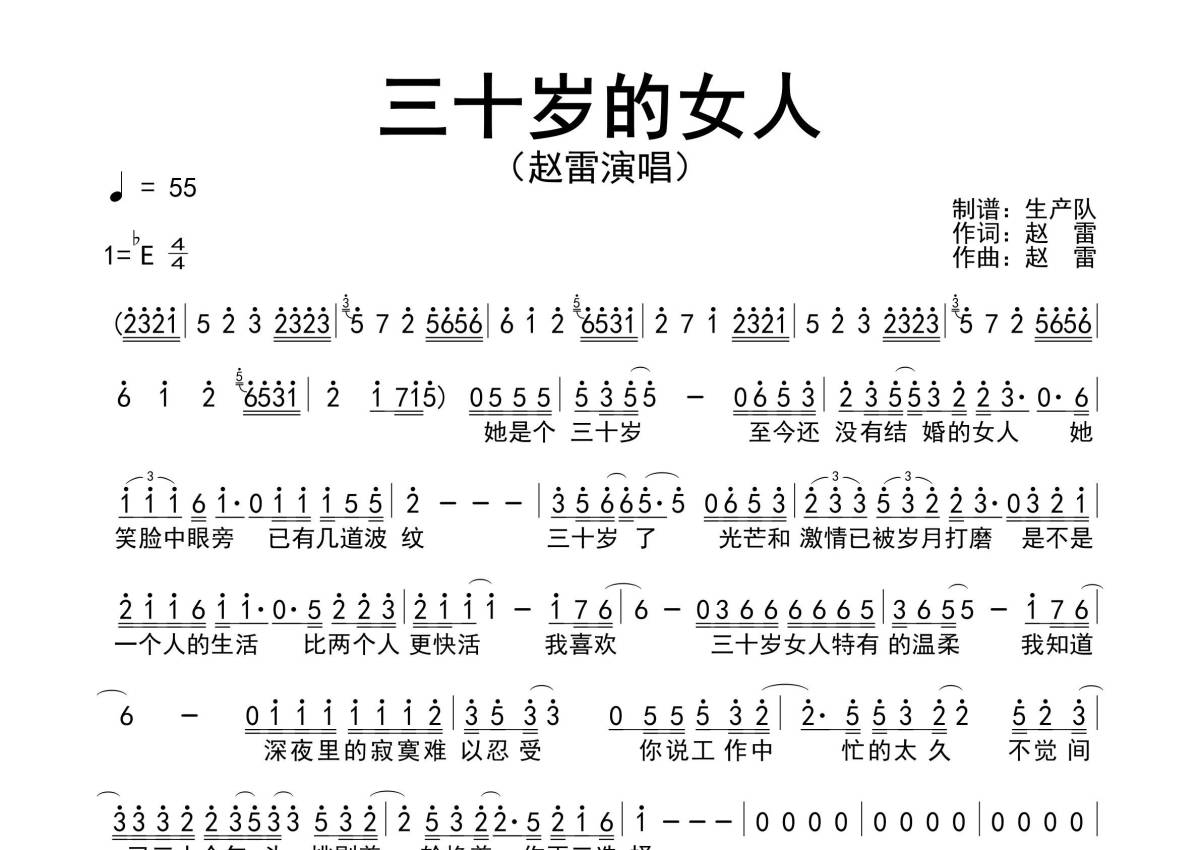 《三十岁的女人》是赵雷演唱的一首歌曲,原版简谱,拍号为4/4拍,歌曲速度为每分钟55拍,这份简谱共有一张高清图谱,图谱由 @生产队 编配上传赵雷演唱的歌曲《三十岁的女人》原版简谱。
